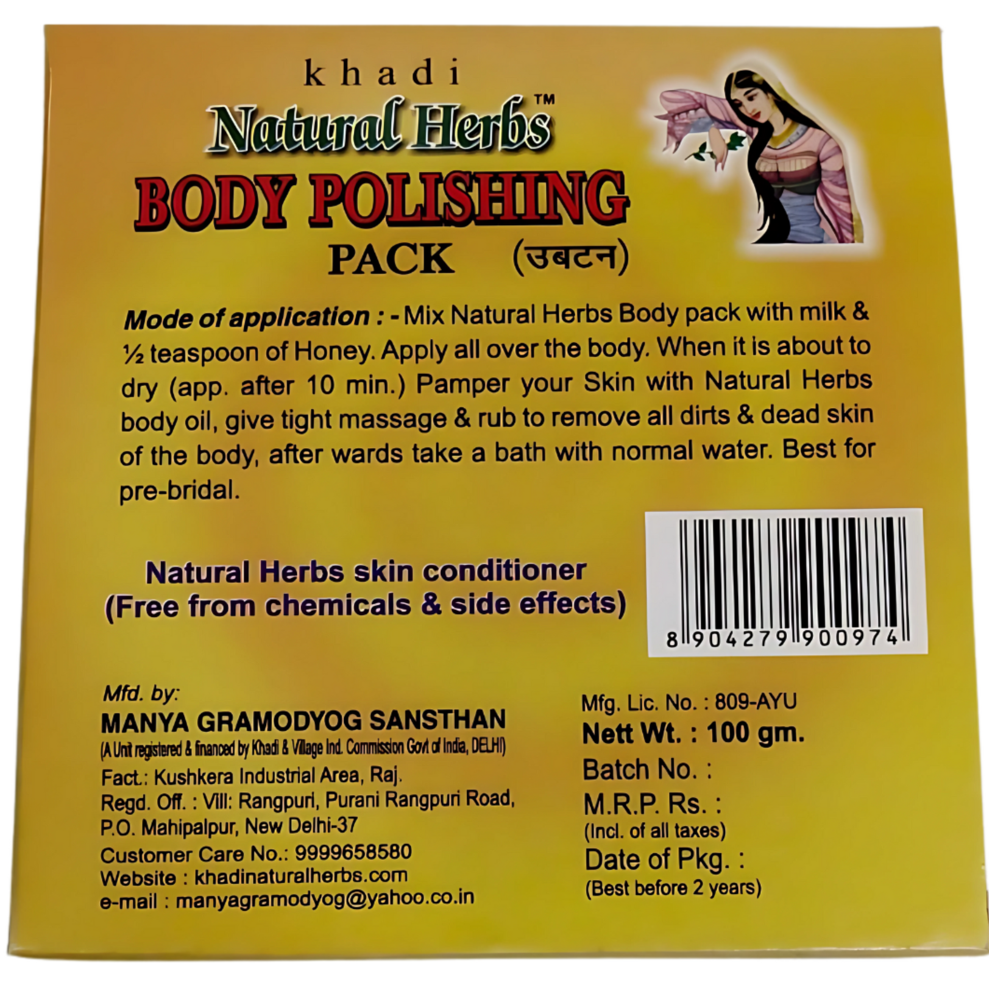 Khadi Natural Herbs Body Polishing Ubtan is an age-old face mask & body mask made with natural and ayurvedic ingredients to give you the skin of your dreams. It gives you flawless and glowing skin and has been used as a beauty treatment for to-be brides for ages now. Filled with the goodness of herbs, spices, pulses and even nuts, the natural face pack recipe can even be tweaked according to your skin type and problems. with Chandan, Kesar, Turmeric Powder to exfoliate the dead skin & polish to make the skin glossy. Chemical Free Product.