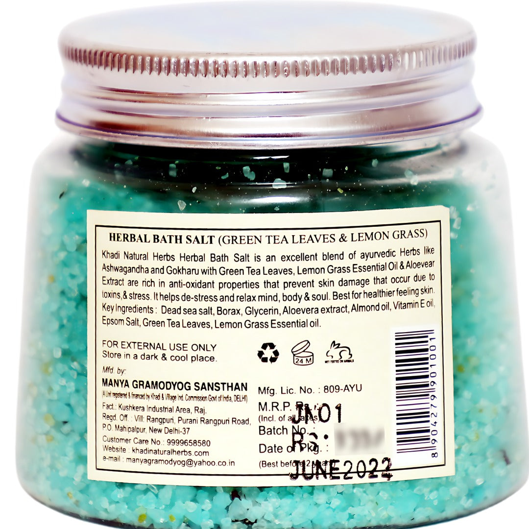 Khadi Natural Herbs Hydrating Bath salt with Green Tea Leaves & Lemon Grass Essential Oil, nourishes dull skin and improves oily skin. Lemon Grass Essential Oil promotes healthy and clear skin. The Green Tea hydrates & cools tired skin. It's a Paraben & Sulfate free Product.