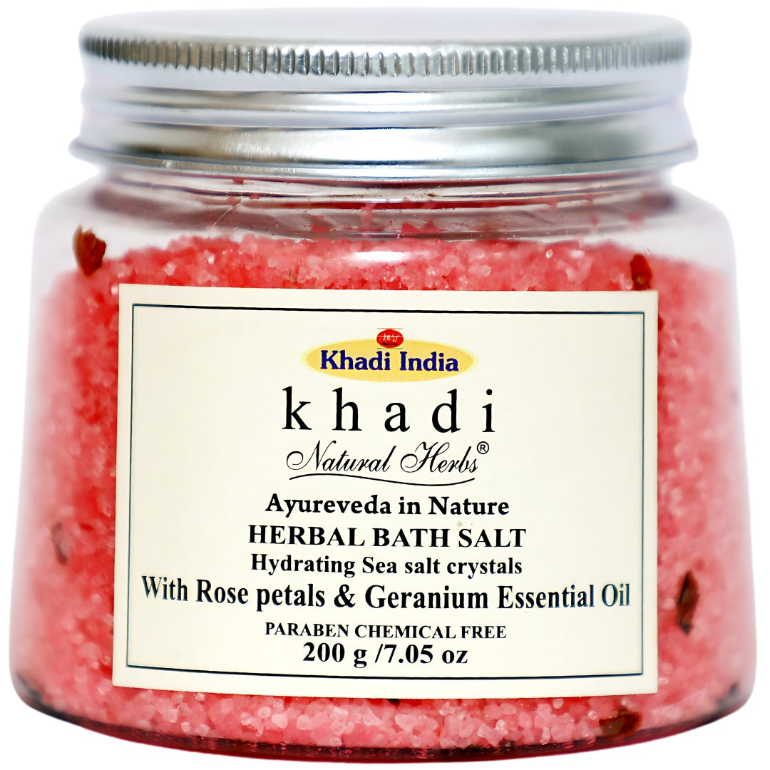 Khadi Natural Herbs Hydrating Bath salt with Rose Petals, Rose & Geranium Essential Oil Scrubs off dirt and dead cells and keep skin silky soft. Balances skin pH levels. Also reduces oily skin, relaxes the mind and body. Naturally scented with the soft soothing scent of Rose Geranium Essential Oil.