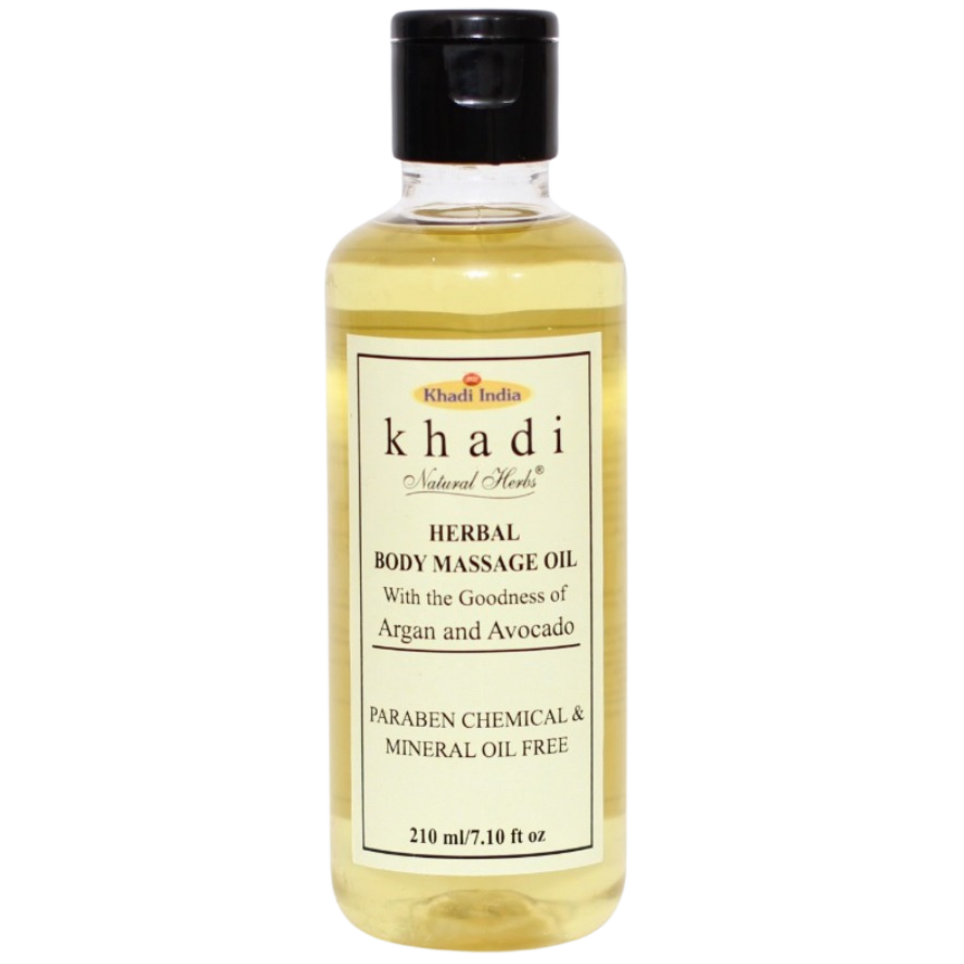 Khadi Natural Herbs Herbal Body massage Oil Argan with Avocado a soothing body oil that locks in moisture, deeply hydrates your skin and helps to reduce skin pigmentation. Pure & Natural Argon Oil, Avocado Oil, Cedarwood Essential Oil, Daruharidra. Paraben & Silicon free.