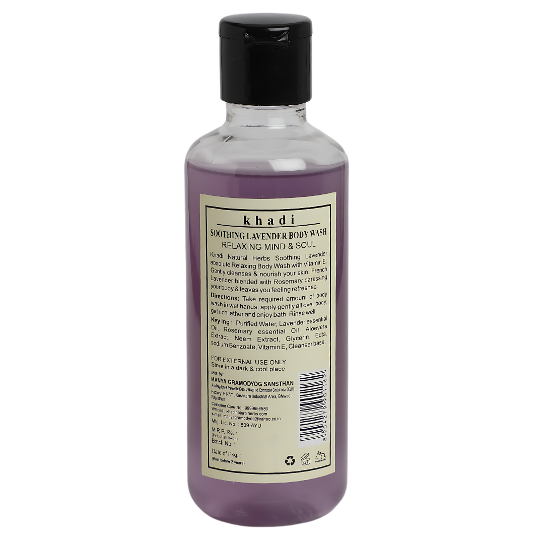 Khadi natural Herbs Lavender Body Wash is infusedwith the "flower power" Of natural floral extracts & Pure Lavender essential Oil for beautifully glowing skin. Absolute Relax body wash helps relax your body and leaves your skin feeling soft and smooth for a brilliant beauty experience. Lavender deeply cleanses the skin and removes dead skin cells, to give a refreshing after-shower feel. Free from paraben Chemicals.