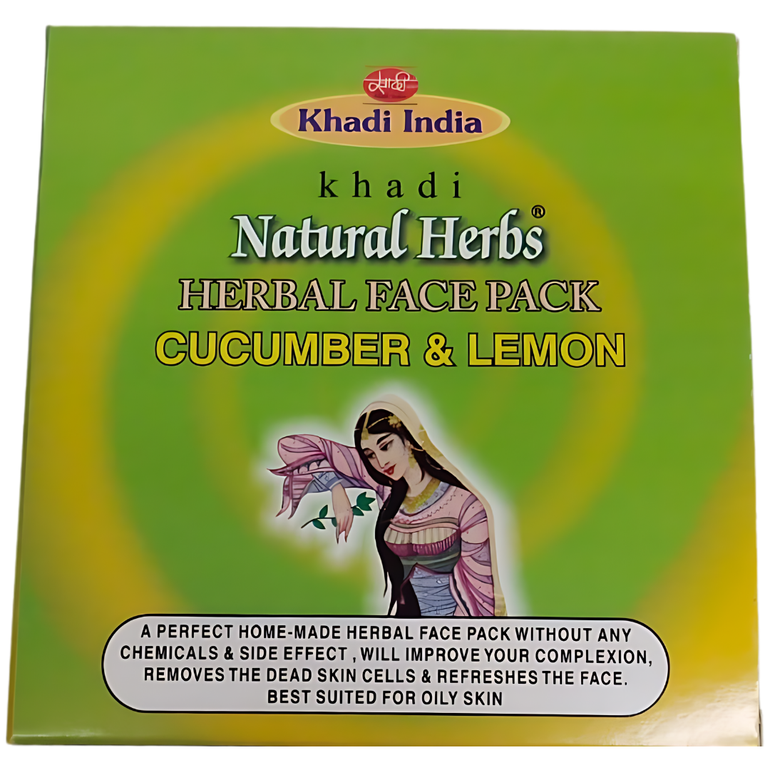 khadi Natural Herbs Cucumber & Lemon Face Pack stops oil secretion & anti - tanning.Cucumber & Lemon face Pack can help you regenerate and restore your skin and erase all the sun damage. It is Paraben Free, consists of cucumber & Lemon Peel Powder to make the skin clear & acne free.